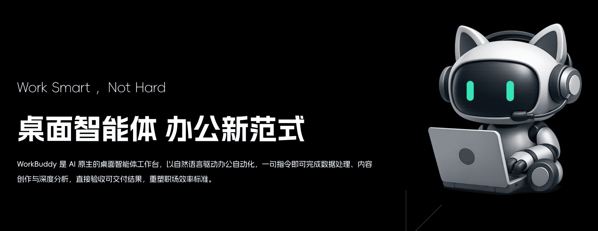 WorkBuddy ↗ 是腾讯云代码助手团队推出的桌面 AI 智能体工作台,口号是「Work Smart,Not Hard」。简单说:它不是一个对话助手,而是一个真正能「动手」的 Agent——你用自然语言说出需求,它在你本地电脑上自主规划、执行并交付结果。
