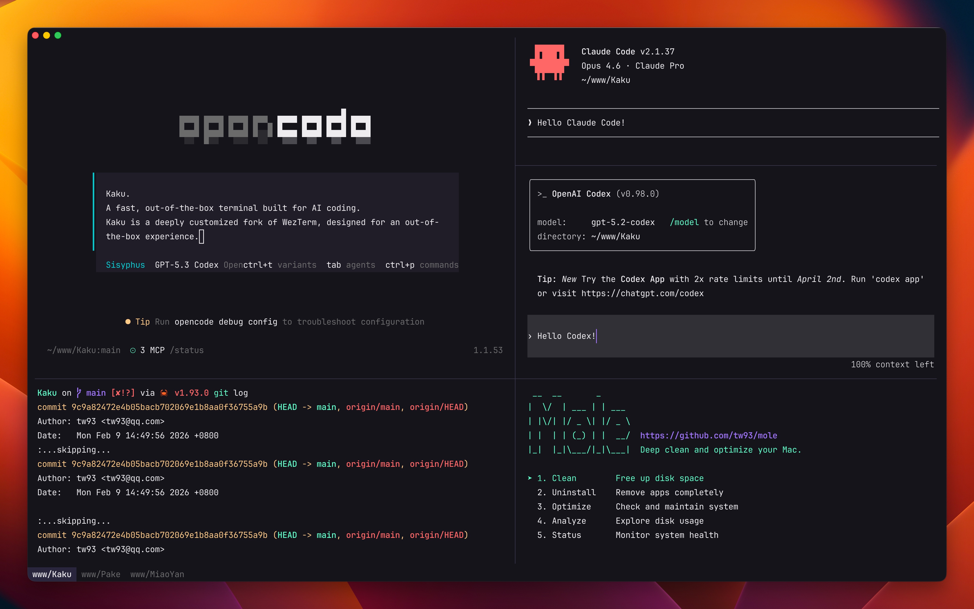 Kaku ↗ 是 tw93 基于 WezTerm 深度定制的 macOS 终端,专门为 AI 编程场景打造。它的定位很简单:开箱即用、极速轻量、原生支持各类 AI 编程工具。MIT 开源,完全免费。