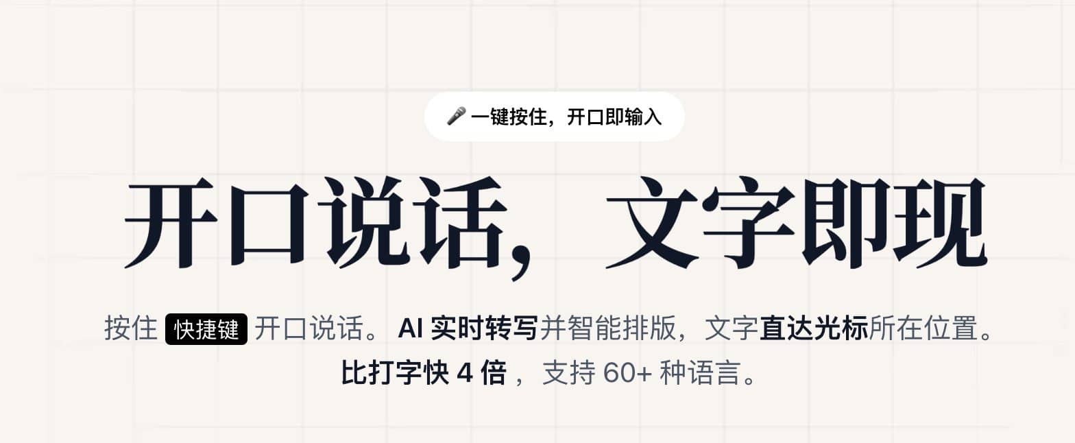 TypeOff ↗ 是一款系统级的 AI 语音输入工具,按住快捷键说话,松开后文字直接出现在光标位置。号称比打字快 4 倍,支持 60 多种语言,macOS 和 Windows 都能用。